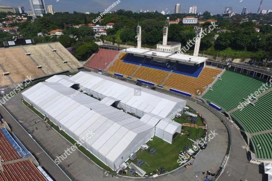 Image 6: Tented structures erected inside Sao Paulo’s Pacaembu Stadium to serve as a field hospital.