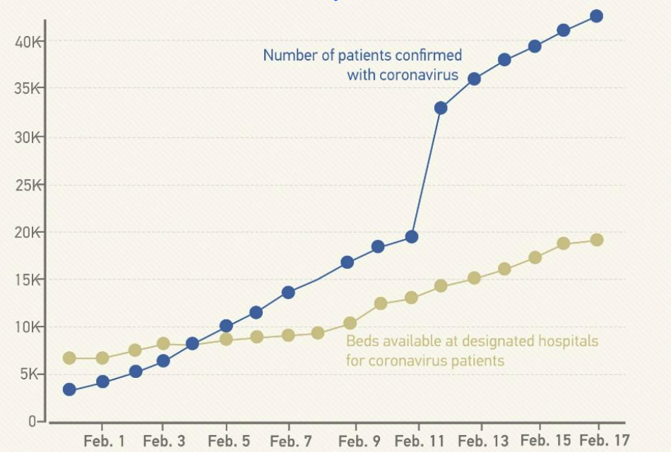 Image 1: The graph shows the spread of infection versus available hospital space in Wuhan, China within the first three weeks of the lockdown ordered on 23rd January,2020.